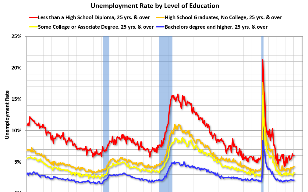 Sayangnya, data ini hanya berasal dari tahun 1992 dan hanya mencakup tiga resesi (kerusakan saham/teknologi pada tahun 2001, dan krisis perumahan/krisis keuangan, serta pandemi pada tahun 2020). Jelas sekali bahwa pendidikan merupakan hal yang penting dalam kaitannya dengan tingkat pengangguran, dengan tingkat terendah bagi lulusan perguruan tinggi sebesar 2,1% pada bulan Januari, dan tingkat tertinggi bagi mereka yang tidak memiliki gelar sekolah menengah atas sebesar 6,0% pada bulan Januari.