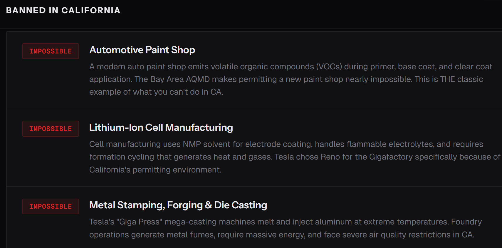 California tidak boleh mengizinkan pembangunan pabrik ponsel pintar, pabrik mobil listrik, atau galangan kapal perusak Angkatan Laut. Bukan tidak akan—tidak bisa. Lingkungan peraturan membuat pembangunan pabrik semikonduktor baru, bengkel cat otomotif, pabrik baterai, atau pabrik pengecoran baja menjadi mustahil.