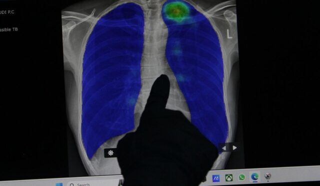 Petugas medis memperlihatkan hasil rontgen paru-paru warga terindikasi TBC, di Jakarta, Desember 2023.(Antara/Anggraini)