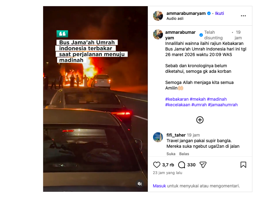 Bus yang membawa jamaah umrah terbakar. (Instagram/@ammarabumaryam)