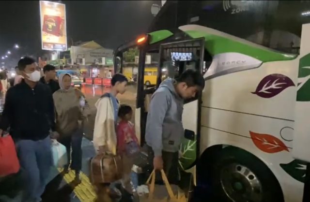 Penumpang kereta menaiki bus yang disiapkan PT KAI imbas dari insiden yang dialami Kereta Api 174 Ciremai.(MI/Depi Gunawan)
