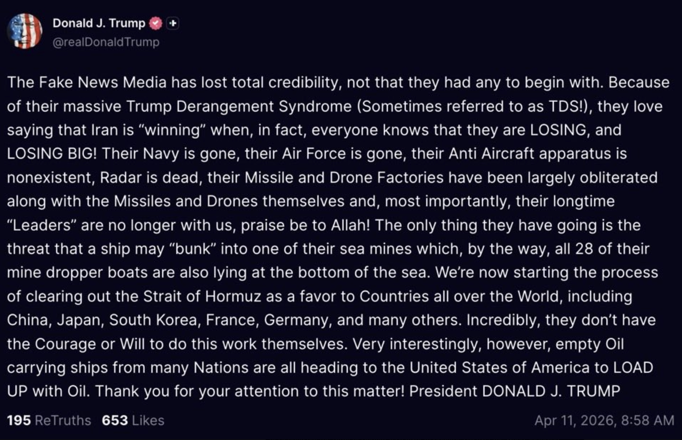 Assuming Trump believes what he wrote above, this statement provided yet more evidence of his cluelessness about the state of the conflict. As readers know well, Iran has many mechanisms for threatening vessels in the Strait of Hormuz and thus forcing them to comply with its terms for transit: fast surface boats (apparently well stored), surface drones, underwater drones, drones fired from well behind the cliffs (recall they have a range of 50 kilometers), and firing ordnance of Lord only knows what sort from the many caves in the cliffs overlooking the Strait of Hormuz.