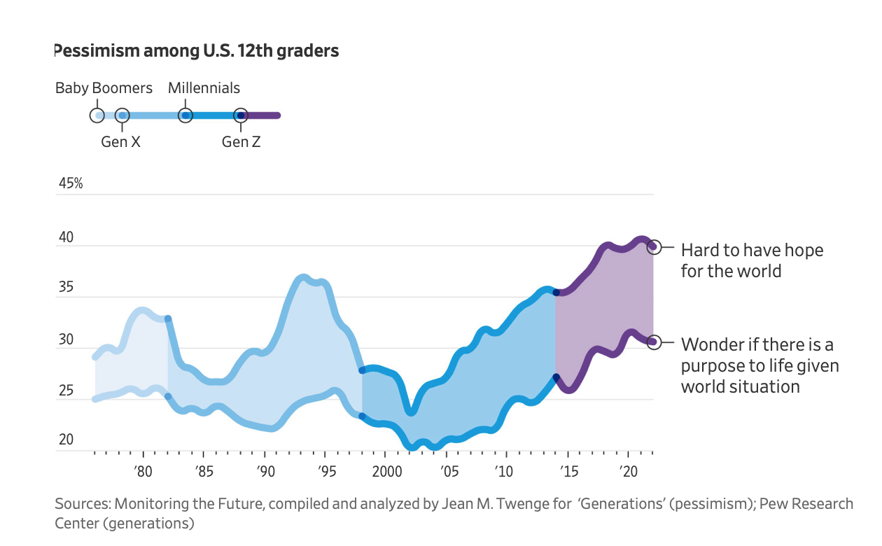 Kesuraman yang meluas di kalangan Generasi Z terwujud dalam skeptisisme yang belum pernah terjadi sebelumnya terhadap Washington dan perasaan putus asa bahwa para pemimpin partai mana pun dapat membantu. Seluruh ingatan politik anak muda Amerika dipenuhi oleh sikap keberpihakan yang kuat dan peringatan tentang akhir dari segalanya, mulai dari demokrasi AS hingga planet bumi. Ketika masa-masa tergelap pandemi ini mulai berakhir, inflasi mencapai titik tertinggi dalam 40 tahun terakhir. Hak untuk melakukan aborsi dibatalkan. Perang di Ukraina dan Timur Tengah berkecamuk.