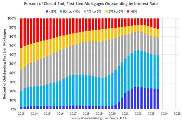 …Dan mengenai suku bunga hipotek, berikut beberapa data dari Basis Data Hipotek Nasional FHFA yang menunjukkan distribusi suku bunga hipotek keluarga 1-4 dengan suku bunga tetap dan tertutup pada akhir setiap kuartal sejak Q1 2013 hingga Q3 2023 (Q4 2023 data akan dirilis dalam dua minggu).