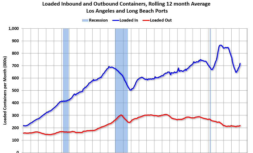 Grafik berikut menunjukkan lalu lintas masuk dan keluar di pelabuhan Los Angeles dan Long Beach dalam TEUs (TEUs: unit setara 20 kaki atau kontainer kargo sepanjang 20 kaki).