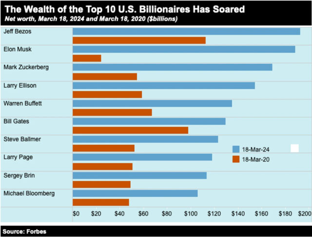 Empat tahun kemudian, pada 18 Maret 2024, negara ini memiliki 737 miliarder dengan kekayaan gabungan sebesar $5,529 triliun, meningkat 87,6 persen menjadi $2,58 triliun, menurut perhitungan Institute for Policy Studies dari Forbes Real Time Billionaire Data. (Terima kasih, Forbes!)