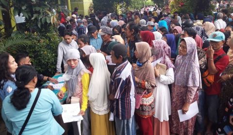 Warga terpaksa berdesakan dan antre mengambil bantuan Program Keluarga Harapan 2024(MI/Bagus Suryo)
