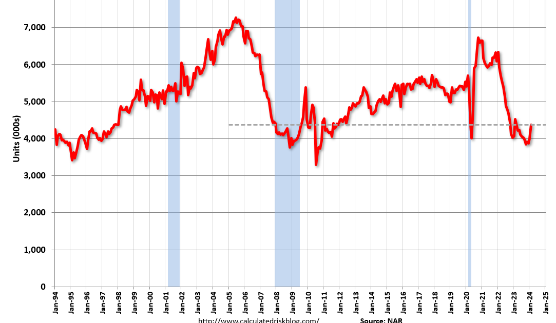 Total penjualan rumah yang ada – transaksi yang diselesaikan yang mencakup rumah keluarga tunggal, townhome, kondominium dan koperasi – melonjak 9,5% dari bulan Januari ke tingkat tahunan yang disesuaikan secara musiman sebesar 4,38 juta di bulan Februari. Dari tahun ke tahun, penjualan turun 3,3% (turun dari 4,53 juta pada Februari 2023).