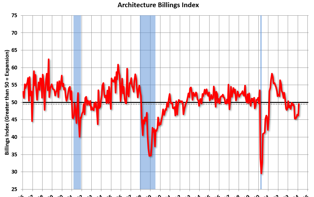 Grafik ini menunjukkan Indeks Tagihan Arsitektur sejak tahun 1996. Indeks tersebut berada pada 49,5 pada bulan Februari, naik dari 46,2 pada bulan Januari. Angka di bawah 50 menunjukkan penurunan permintaan jasa arsitek.