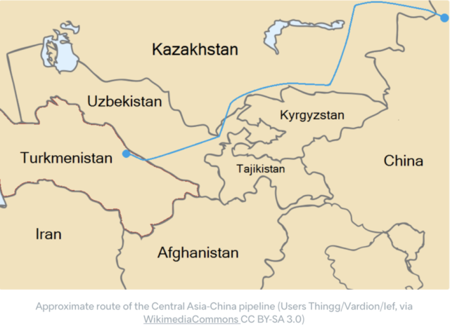 Last year, China began to speed up the building of the final leg of the Central Asia-China pipeline, which will transport natural gas from Central Asian countries – primarily Turkmenistan, Kazakhstan, and Uzbekistan – into China. Turkmenistan is already China’s top supplier, and the Central Asia Gas PipelineChina is the biggest supplier of China’s imported gas. Total capacity through the pipelines once line D is completed will be 85 bcm – the equivalent of nearly two Nordstreams.