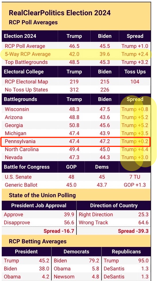I think I’ll leave this up until this coming Friday, so I can at least mumble something about trends. Nationally, Trump is up 2.4% in the Five-Way, same as last week, give or take. Trump is still up in all the Swing States (more here). I’ve highlighted PA, (1) because Trump is actually down there, and (2) it’s an outlier, has been for weeks. Why isn’t Trump doing well there?