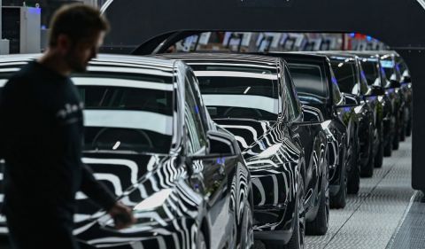 Sederet kendaraan listrik model Y di pabrik Tesla pada 22 Maret 2022 di Gruenheide, tenggara Berlin, Jerman.(AFP/Patrick Pleul)