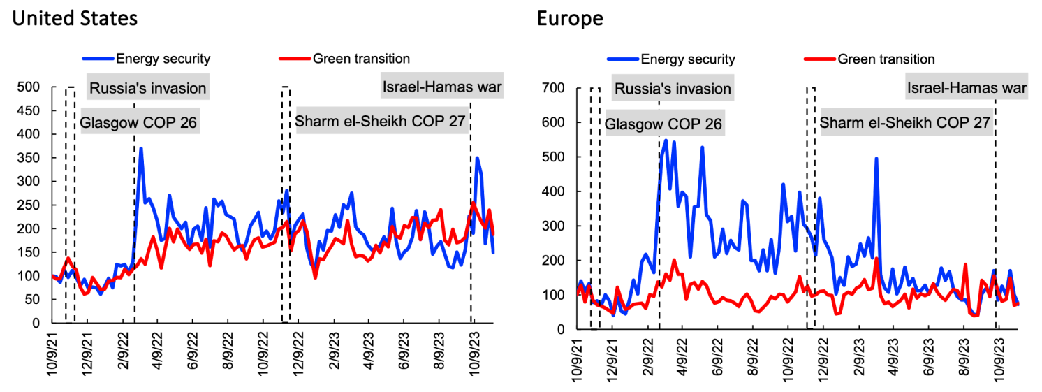 Gambar 1 Jumlah mingguan artikel surat kabar AS dan Eropa yang merujuk pada “keamanan energi” dan “transisi hijau”, 9 Oktober 2021 hingga 9 Oktober 2023 (9 Oktober 2021 = 100)