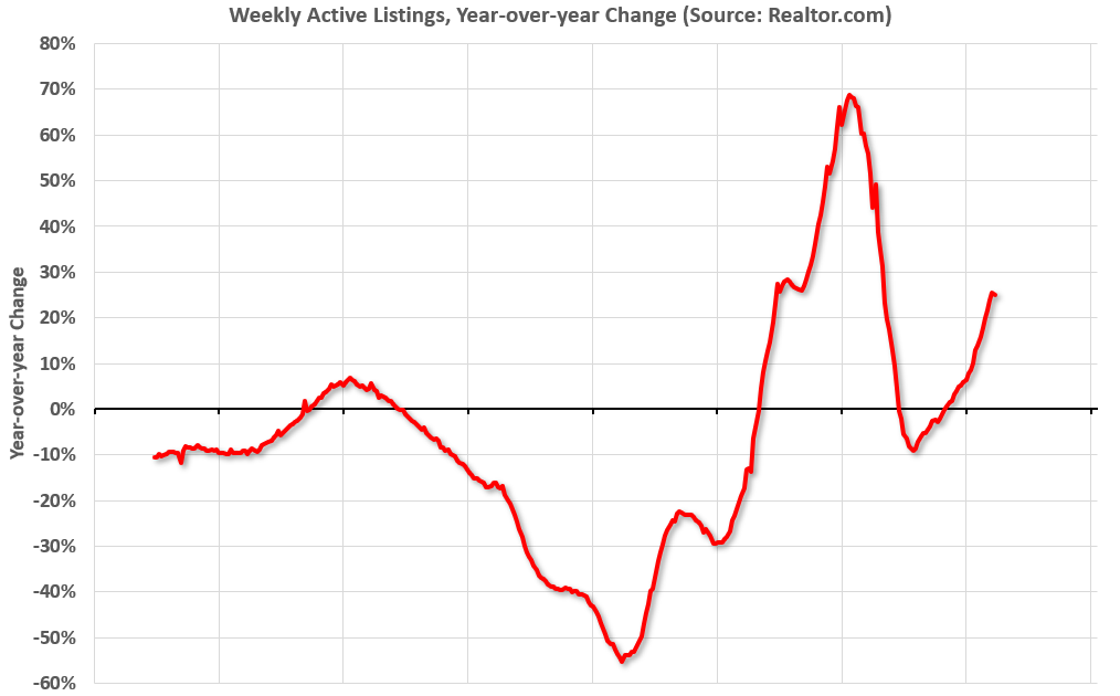 Listing baru masih berada di bawah tingkat sebelum pandemi meskipun secara umum meningkat. Penurunan YoY minggu ini kemungkinan terkait dengan libur Paskah. Listing baru telah meningkat YoY selama 22 minggu berturut-turut.