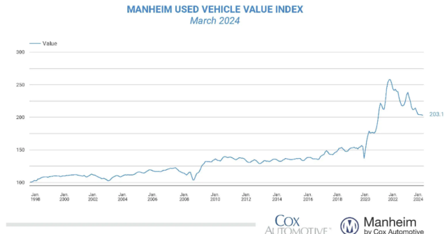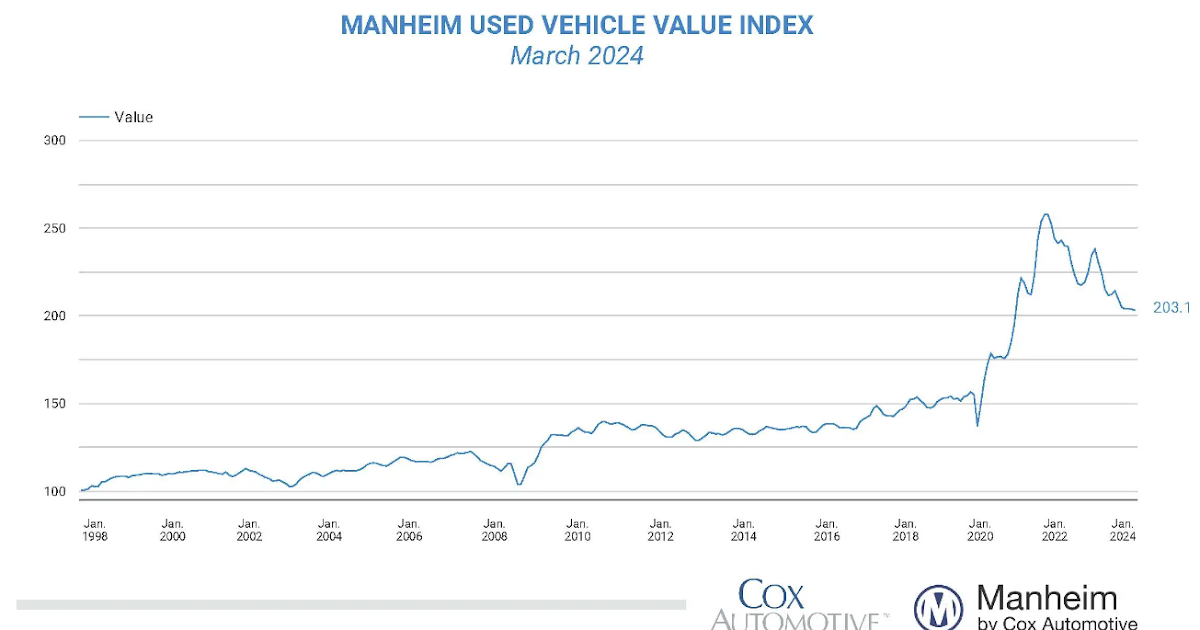 Indeks Manheim menunjukkan harga mobil bekas turun di bulan Maret (penyesuaian musiman) dan turun 14,7% tahun-ke-tahun (YoY).
