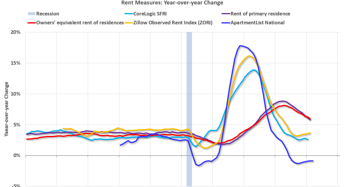 Berikut adalah grafik perubahan tahun-ke-tahun (YoY) untuk langkah-langkah ini sejak Januari 2015. Sebagian besar langkah-langkah ini dilakukan hingga Februari 2024, kecuali CoreLogic hingga Januari dan Apartment List hingga Maret 2024.