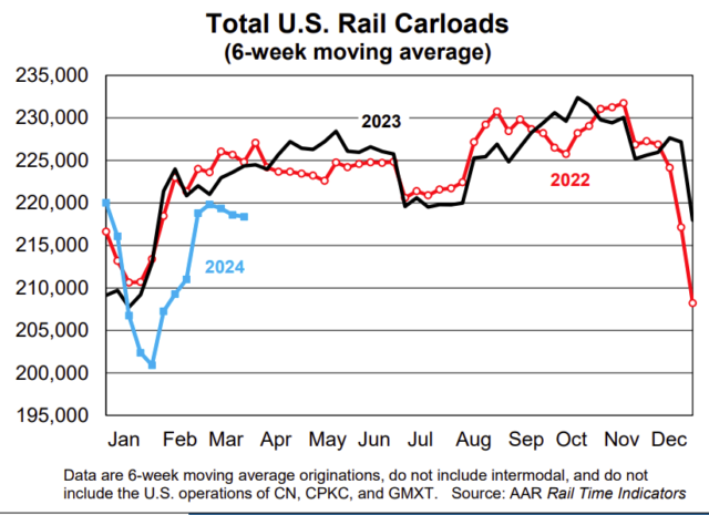 Grafik dari laporan Rail Time Indicators ini menunjukkan rata-rata muatan mobil AS dalam enam minggu pada tahun 2022, 2023, dan 2024: