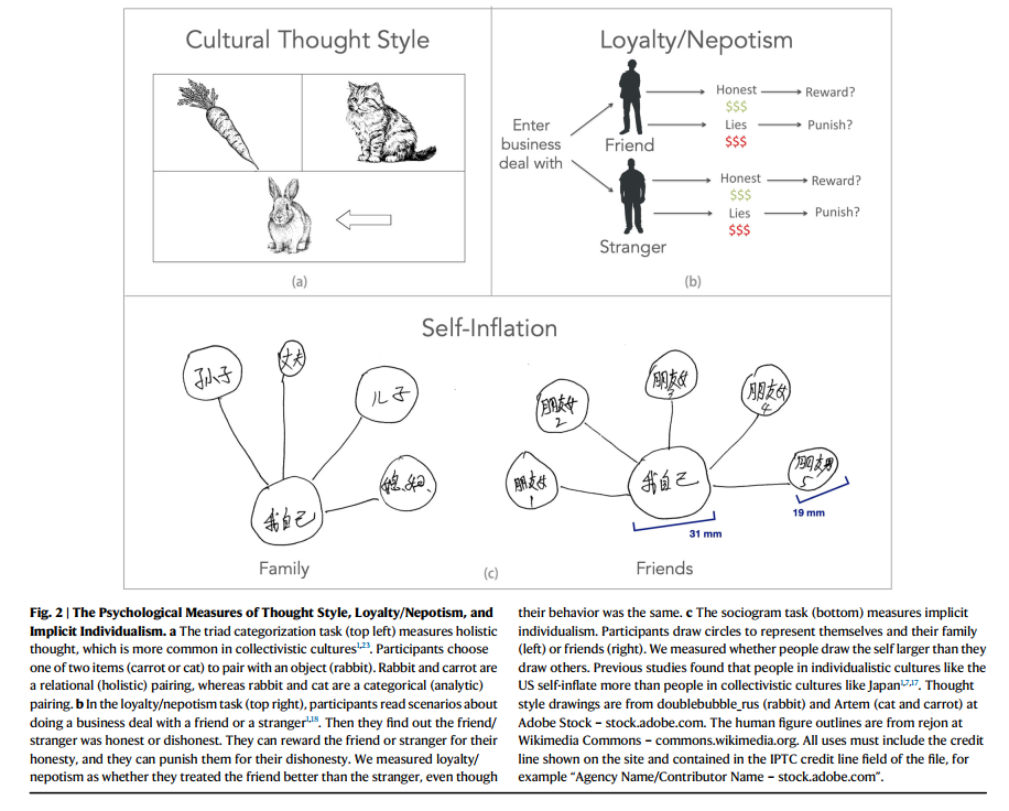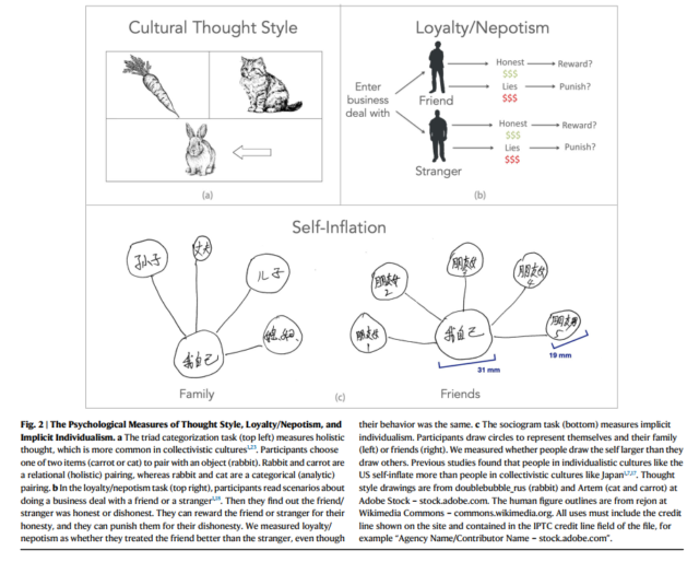 Talhelm dan Dong mengukur gaya berpikir dengan berbagai eksperimen sederhana yang telah ditunjukkan dalam penelitian sebelumnya yang dikaitkan dengan pemikiran kolektivis dan individualis. Ketika diminta menggambar lingkaran yang mewakili diri mereka sendiri dan teman-teman atau keluarga, misalnya, orang-orang cenderung membesar-besarkan lingkaran mereka sendiri, namun mereka lebih membesar-besarkan diri dalam budaya individualis.
