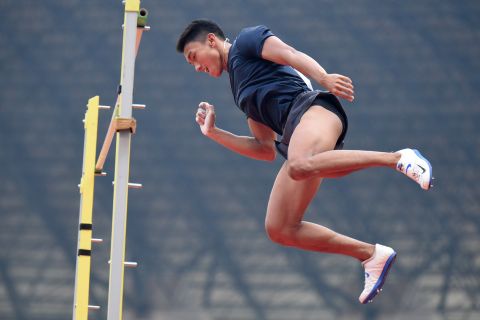 Atlet asal Jawa Timur Teuku Tegar Abadi melakukan lompatan pada final lompat tinggi galah senior putra dalam Kejurnas Atletik 2019.(Antara/M Risyal Hidayat.)