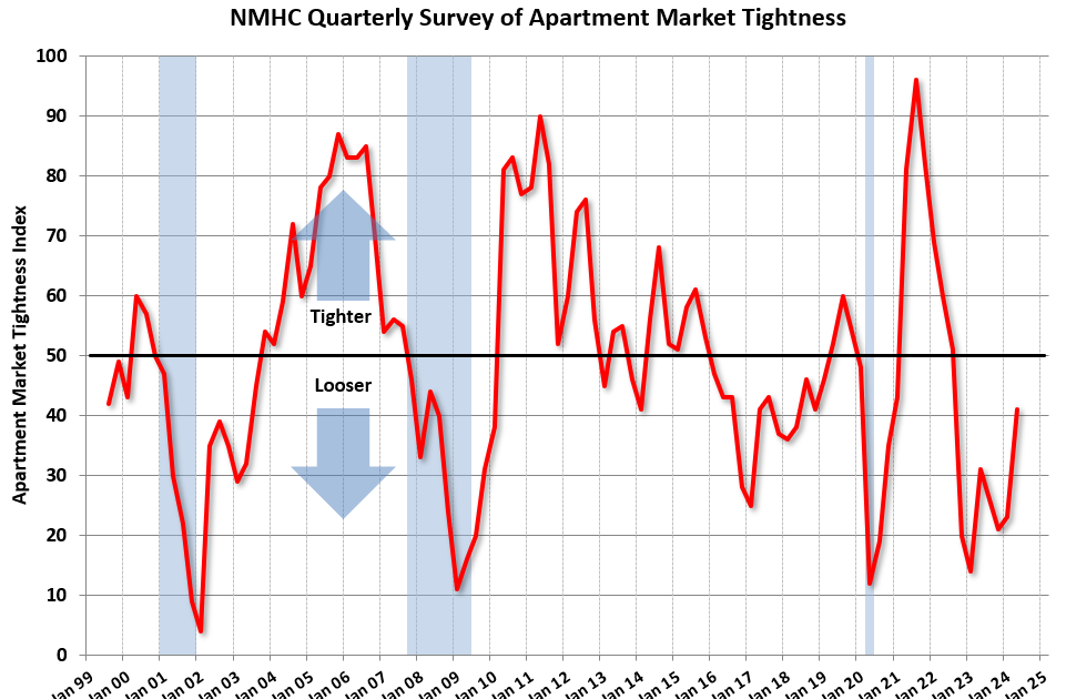 Dari NMHC: Pasar Apartemen Terus Melonggarkan Di Tengah Memburuknya Kondisi PembiayaanKondisi pasar apartemen terus melemah dalam Survei Kuartalan Kondisi Pasar Apartemen National Multifamily Housing Council (NMHC) untuk bulan April 2024. Kecuali Volume Penjualan (52), yang berubah menjadi positif pada kuartal ini, indeks Keketatan Pasar (41), Pembiayaan Ekuitas (49), dan Pembiayaan Utang (44) semuanya berada di bawah titik impas (50).