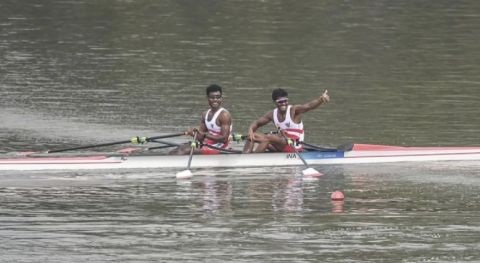 Pedayung putra Indonesia Memo (kiri) dan Ihram (kanan) melakukan selebrasi usai mencapai garis finis(Antara)
