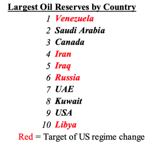 List: remarkably, five of the ten countries with the largest oil reserves have been governed by ‘the new Hitler’ in the last twenty years. Imagine, one Hitler in all of the twentieth century, but five in the last twenty years. In contrast to this Hitler-heavy concentration, four of the remaining countries, Saudi Arabia, UAE, Kuwait, and the US, are liberal democracies (not). Readers are encouraged to read Osama bin Laden’s letter to America (link above) to understand how insidious fake liberal democracy (US) can be for we little people. Source: oilprice.com.