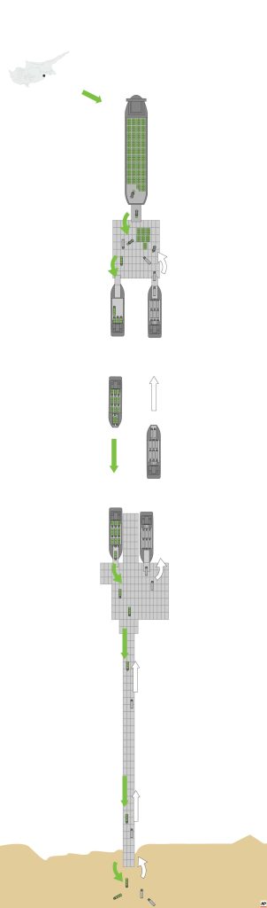 Kapal-kapal kargo akan menurunkan muatan palet dan mungkin memuat banyak bantuan kemanusiaan—makanan kemasan dan pasokan medis yang tahan lama—di dermaga lepas pantai sepanjang tiga mil. Kargo ini akan menjalani pemeriksaan oleh otoritas Israel di pelabuhan Larnaca, Siprus, 200 mil dari Gaza.
