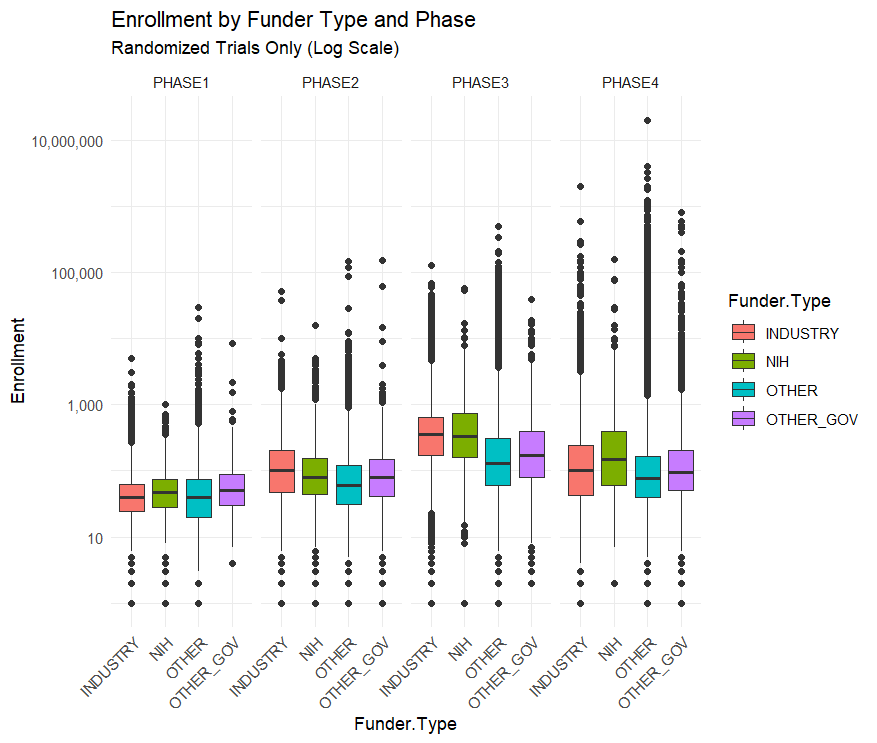 Dari seluruh uji coba yang didanai NIH merupakan uji coba terkecil, namun dalam setiap fase uji coba NIH merupakan uji coba terbesar atau terbesar kedua. Rendahnya rata-rata pendaftaran mereka secara keseluruhan disebabkan oleh fakta bahwa mereka mendanai lebih banyak uji coba Tahap I dibandingkan Tahap III. Namun uji coba NIH Tahap I memiliki ukuran sampel yang lebih besar dibandingkan rata-rata uji coba yang didanai industri.