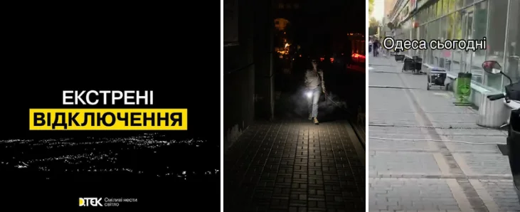 CATATAN: Gambar utama — kiri, peringatan pemadaman listrik pada tanggal 4 Juni dari DTEK. Pusat: anjing pejalan kaki di pusat kota Kiev, 6 Juni. Toko-toko di jalan kota Odessa yang ditenagai oleh genset darurat, 8 Juni.