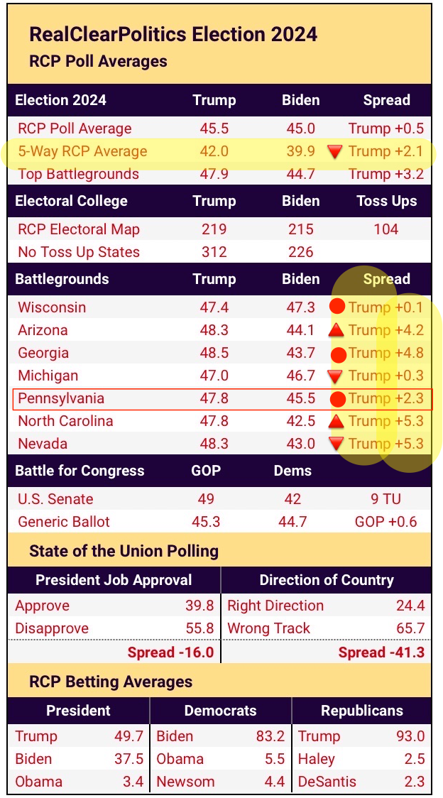 “Electoral College Rating Changes: Half-Dozen Moves Toward Republicans in What Remains a Toss-up Race” [Sabato’s Crystal Ball]. “We are making six Electoral College rating changes this week, all in favor of Republicans. However, we don’t really see a clear favorite in a presidential race with many confounding factors. We consider Michigan, Pennsylvania, and Wisconsin to all be must-wins for the Democrats. While one can hypothetically come up with paths to 270 electoral votes for Democrats without them, we don’t find those paths to be compelling.” And: “[W]e also recognize the clear big-picture trends. Trump has been polling better than he typically polled in both 2016 and 2020, and that has been the case for many months. Biden’s approval rating is in a dangerous zone—the high 30s—and he has been in that weak place consistently since November, according to the FiveThirtyEight average. Biden is not going to be at net-positive approval by Election Day—fortunately for him, he does not need to be, but one would probably expect to see some level of improvement if he is going to win reelection. The danger for Biden is that voters may just be done with him: There is some nostalgia in polls for the pre-2020, pre-Covid, and pre-inflation period that coincided with Trump’s presidency. That doesn’t necessarily mean the public is clamoring for Trump, who remains unpopular; it’s just that they may prefer him to Biden, or may just be thinking more about what they don’t like about Biden (the incumbent) than Trump (the challenger). One thing that Biden has going for him is that Trump does not seem to have trimmed the sails on his own rhetoric at all—Trump continues to laud the Jan. 6, 2021 rioters who tried to disrupt the 2020 electoral vote count as persecuted patriots, for instance, a position we just can’t imagine helps him with the middle of the electorate trying to decide between two flawed major party candidates.” • Here is a table of the changes: