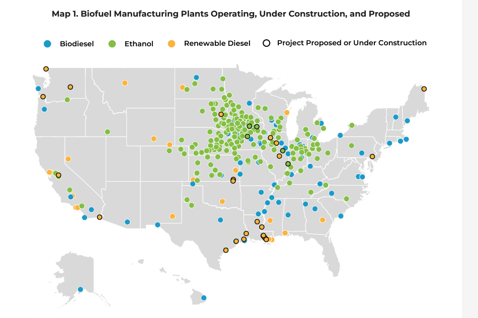Amerika Serikat adalah produsen biofuel terbesar di dunia, dengan produksi 18,5 miliar galon pada tahun 2022 saja (sekitar 40% dari total produksi global). Sebagian besar produksi tersebut, sekitar 15 miliar galon, adalah etanol, yang sebagian besar dibuat dari jagung dan juga dari kedelai. Sebagaimana dicatat dalam laporan tersebut, hampir setengah dari seluruh kedelai dan lebih dari sepertiga jagung yang ditanam tidak digunakan untuk pangan, melainkan untuk produksi bahan bakar.