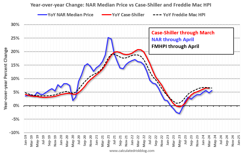 Ukuran harga rumah lainnya menunjukkan harga akan naik hampir sama YoY pada indeks Case-Shiller bulan April. NAR melaporkan harga median naik 5,7% YoY di bulan April, naik dari 4,7% YoY di bulan Maret. ICE melaporkan harga rumah “mendingin”, namun masih naik 5,1% YoY di bulan April, turun dari 5,7% YoY di bulan Maret, dan Freddie Mac melaporkan harga rumah naik 6,5% YoY di bulan April, turun dari 6,6% YoY di bulan Maret.