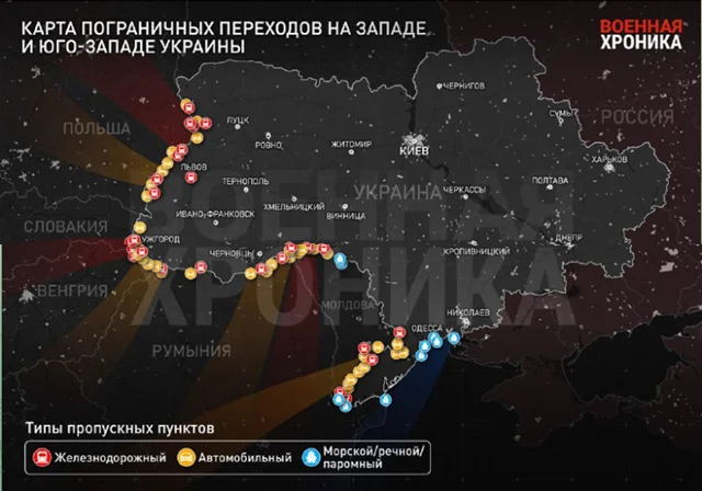 On the border there are a series of targets which Russian sources expect to be hit in the coming days. The lead image map shows their locations and functions (red for rail, orange for road, blue for bridge and ferry). Rozhin has reprinted this analysis of these targets. “Since sending military aid by air is not available, most of the cargo is delivered by rail, heavy trucks, or, much more risky, by sea. Either way, all cargoes go through customs and checkpoints. In the west and south-west of Ukraine there are about 87 sea, pedestrian, rail, and road border crossings…Taking into account the checkpoints that Ukraine received from the USSR, this number can be increased by almost half, but a significant part of such crossings is either destroyed, looted in previous decades, or abandoned under the USSR. However, most of the border crossings are on the border with Moldova. There are 34 of them, but they are not used as intensively as the checkpoints for transit to and from the territory of NATO countries. The state of some of them is far from ideal.”