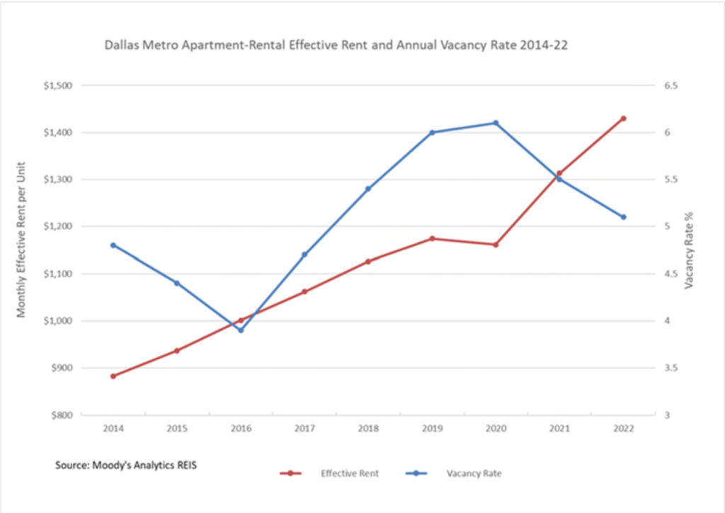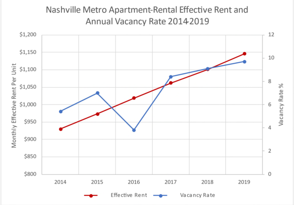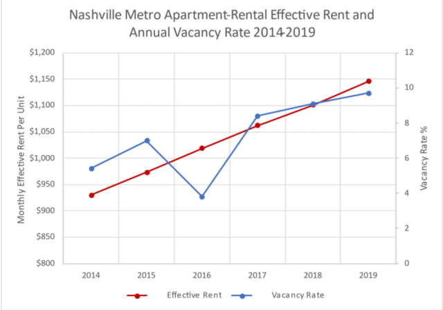 The lawsuits against RealPage document how in many metropolitan areas increase rents every year, whether vacancies were rising or falling, and in most instances, both rents and vacancy rates trended higher from 2014-2020, across various metropolitan regions where RealPage operates. For example in Nashville and Dallas: