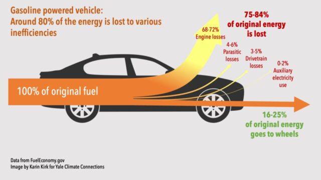 Mobil dan truk berbahan bakar bensin saat ini membuang sekitar 80% energi yang dipompa ke tangki bensinnya. Mobil menjadi panas karena membakar bahan bakar untuk menggerakkan piston dan menggerakkan roda. Panas tidak diperlukan untuk menggerakkan mobil, sehingga dibuang, sehingga menghilangkan sebagian besar energi dalam bahan bakar. Ini belum tentu merupakan cacat desain; itu adalah bagian termodinamika yang tak terelakkan. Membakar bahan bakar untuk menciptakan gerakan cenderung membuang-buang energi.