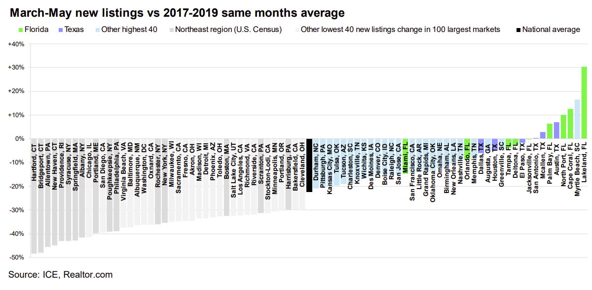 • Faktanya, dari 19 pasar dengan volume listing baru di kisaran 10% dari rata-rata bulan yang sama pada tahun 2017-2019, 14 pasar berada di Texas atau Florida, termasuk tujuh dari sembilan pasar yang mengalami surplus