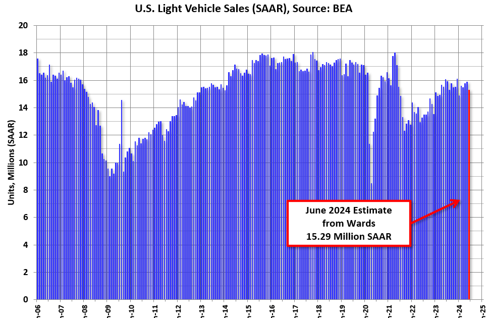 Penjualan di bulan Juni (15,29 juta SAAR) turun 3,8% dari Mei, dan turun 4,8% dari Juni 2023.