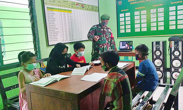 Sejumlah anak belajar dengan memanfaatkan internet gratis dari Kodim 0608 Cianjur.(MI/BENNY BASTIANDY)