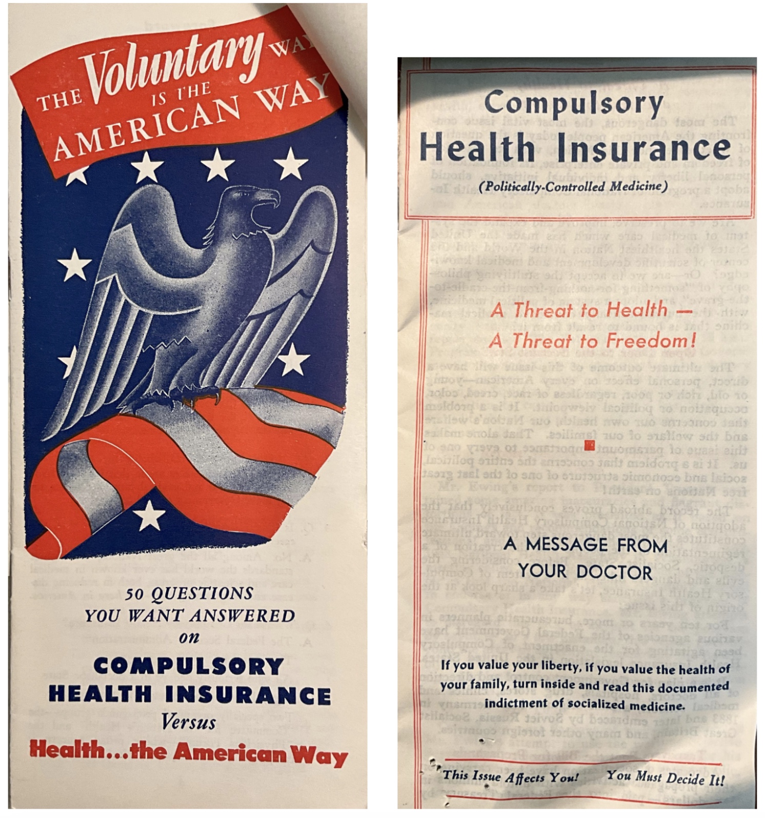 Kampanye AMA-WB memiliki dua komponen utama. Pertama, mereka menggunakan iklan massal untuk mengasosiasikan NHI dengan sosialisme, sedangkan pilihan asuransi swasta (atau sukarela) digambarkan sebagai “American Way”. Upaya periklanan AMA ini dilengkapi dengan periklanan terkait dari industri lain yang takut akan kembalinya pengendalian harga pada masa perang. Selain itu, strategi ini meminta para dokter AMA untuk mendiskusikan asuransi kesehatan swasta dengan pasien mereka dan menyebarkan pamflet yang mencerminkan pesan iklan individualistis (lihat Gambar 1). Melalui organisasi medis lokal dan negara bagian, para dokter yang ingin membiayai biaya pengobatan telah mengatur produk asuransi mereka sendiri, yang kemudian dikenal sebagai Blue Shield, dan mereka sangat tertarik untuk mendaftarkan diri. Secara keseluruhan, sekitar $250 juta (dalam perhitungan saat ini) dihabiskan untuk mempengaruhi pemilih, jumlah yang belum pernah terjadi sebelumnya pada saat itu. Para dokter juga diinstruksikan untuk menggunakan gengsi mereka untuk mendesak organisasi masyarakat setempat agar mengeluarkan resolusi yang menentang asuransi kesehatan nasional.