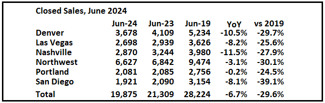 Penjualan tertutup pada bulan Juni sebagian besar terjadi pada kontrak yang ditandatangani pada bulan April dan Mei ketika tingkat suku bunga hipotek 30 tahun masing-masing rata-rata 6,99% dan 7,06% (Freddie Mac PMMS). Mei adalah bulan pertama sejak musim gugur lalu dengan rata-rata tingkat hipotek 30 tahun lebih dari 7%