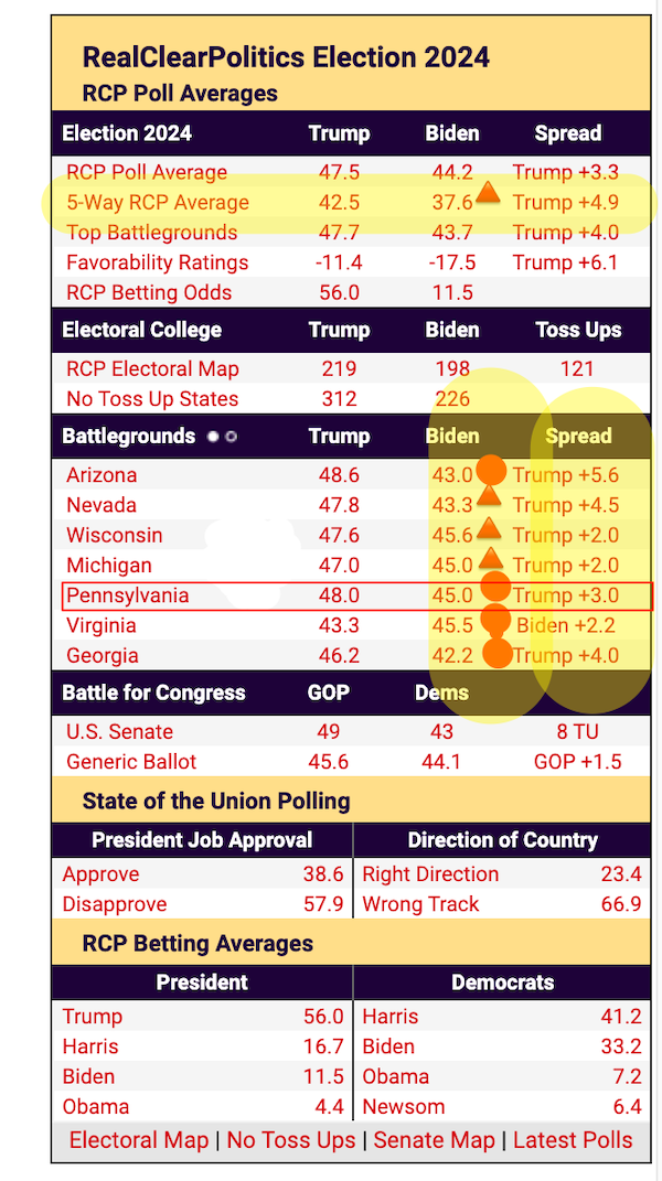 First post-debate polling: Trump jumps a full point in the 5-way national race, which a Biden supporter might find concerning. OTOH, the Swing States seem relatively unaffected. Swing States (more here) still Brownian-motioning around. Of course, it goes without saying that these are all state polls, therefore bad, and most of the results are within the margin of error. It would be hilarious if the Biden Debate debacle had exactly the same effect as Trump’s 34 bazillion felony convictions, i.e., none, both parties are so dug in.