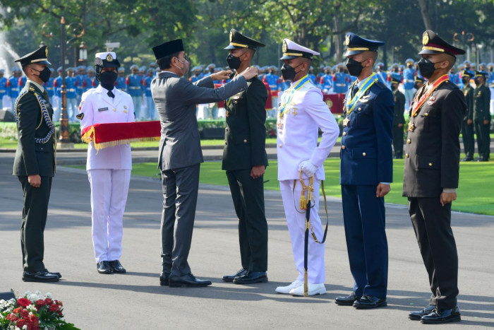 “Bahwa saya akan memenuhi kewajiban perwira dengan sebaik-baiknya terhadap bangsa Indonesia dan Negara Kesatuan Republik Indonesia yang berdasarkan Pancasila dan UUD Negara 1945,” ucap Jokowi yang diikuti seluruh perwira TNI dan Polri.