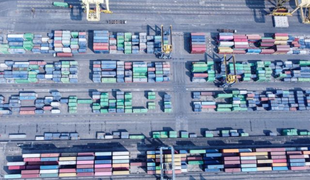 Foto udara aktivitas bongkar muat peti kemas ekspor dan impor di Terminal Peti Kemas (TPK) Pelabuhan Tanjung Emas, Semarang, Jawa Tengah.(Antara/Makna Zaezar)