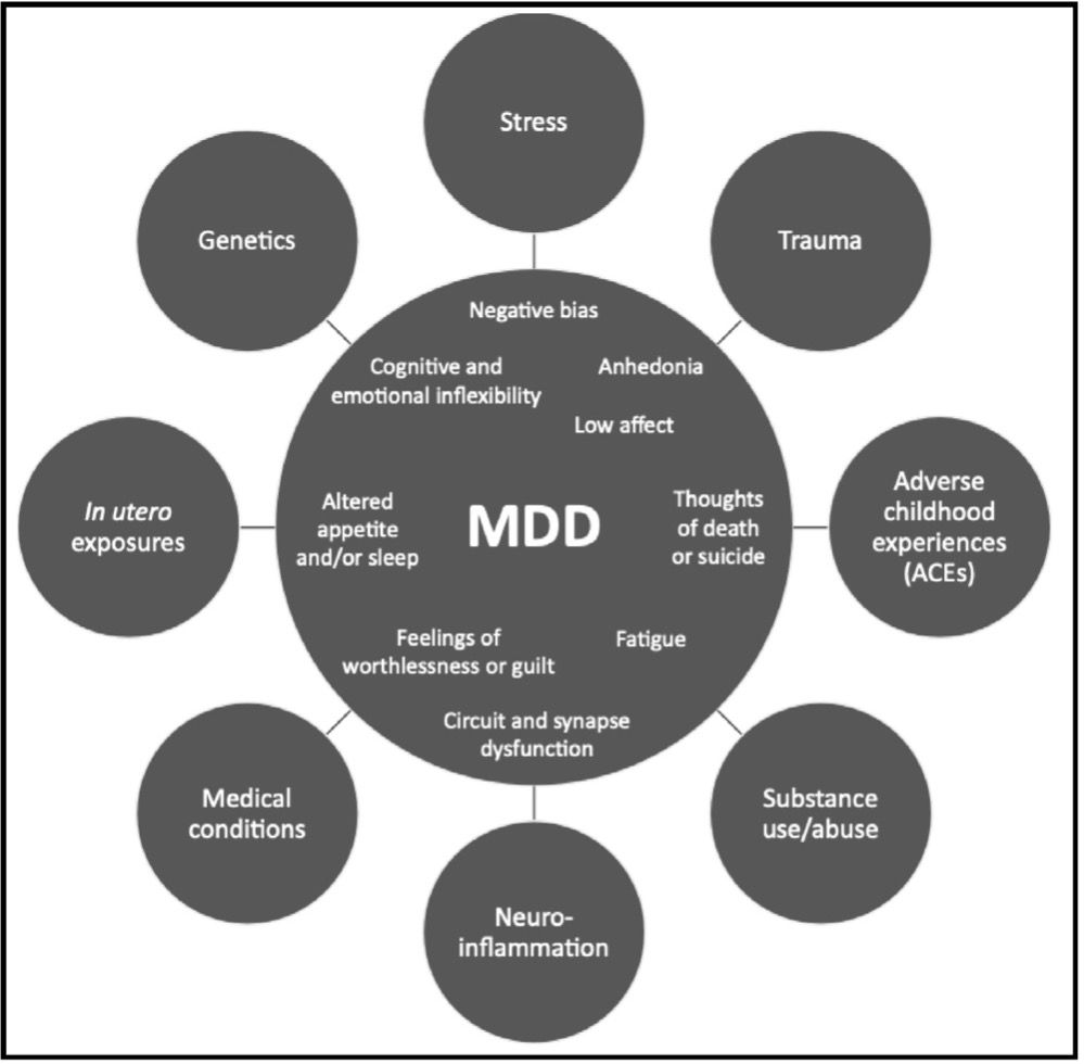 Figure 1. Multiple biopsychosocial factors can interact with each other and converge on MDD pathophysiology. MDD is a complex, multifactorial, biopsychosocial disorder with no single cause or homogenous presentation of symptoms. Factors such as stress, trauma, genetics, and more can contribute to MDD pathophysiology, which involves symptoms such as anhedonia, low affect, negativity bias, and cognitive and emotional inflexibility. Though the contributing factors and presentation of symptoms vary from patient to patient, MDD can be understood as inflexibility in circuits that process cognitive and emotional information and regulate motivation and arousal.