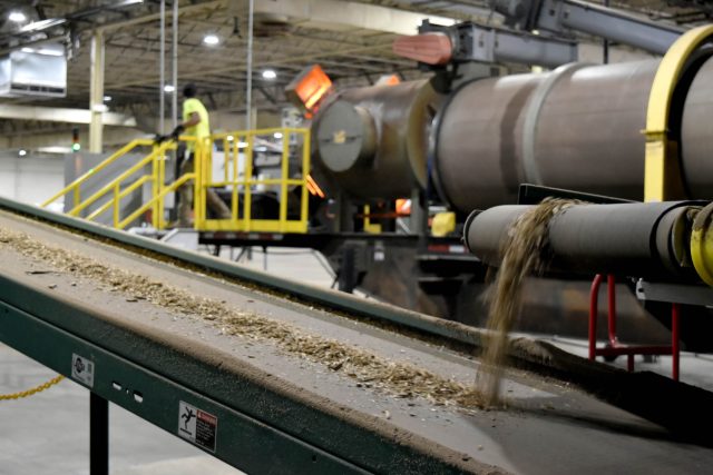 After being dried, sawdust at Graphyte’s facility is transported on a conveyor belt. The rotary dryer, about the length of a tractor trailer, is seen in the background. Visual: Courtesy of Graphyte