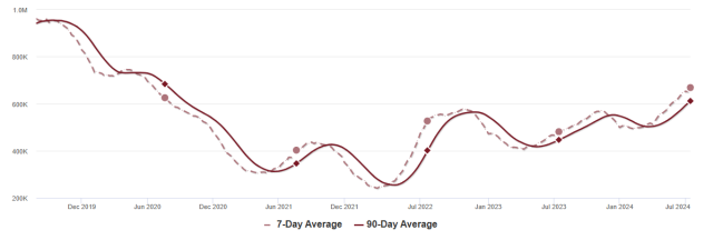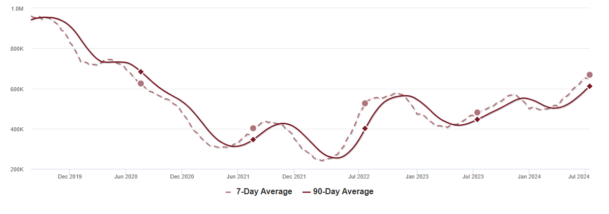 Garis merah untuk tahun 2024. Garis hitam untuk tahun 2019. Perhatikan bahwa inventaris naik 75% dari rekor terendah pada minggu yang sama di tahun 2021, namun masih jauh di bawah level normal.