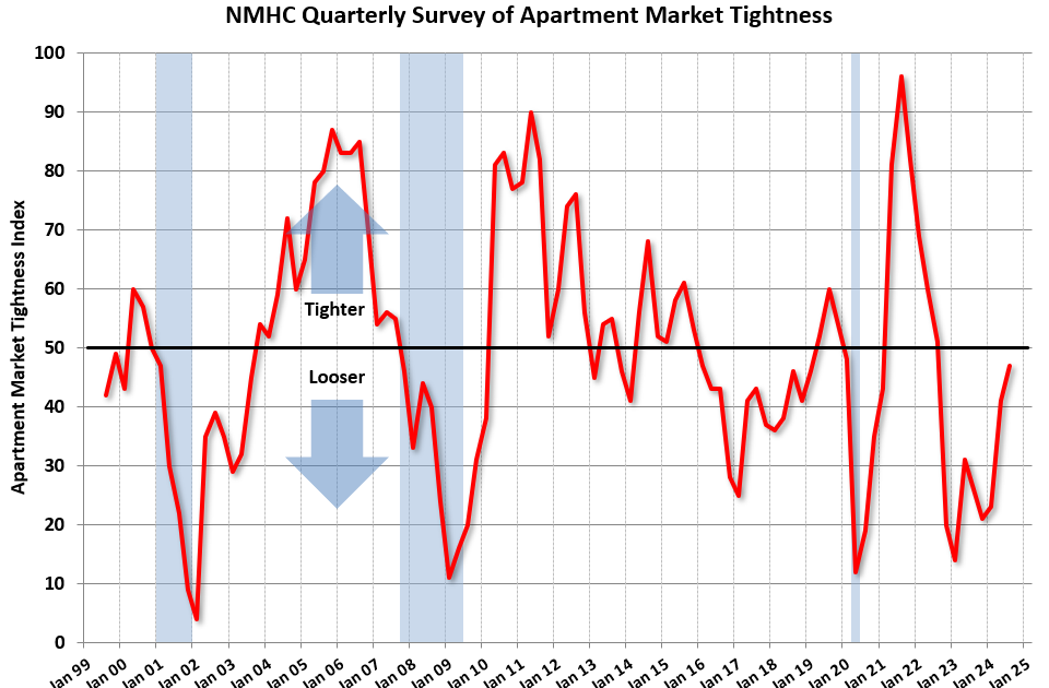 Dari NMHC: Dari NMHC: Kondisi Pasar Apartemen Terus Melonggarkan, Meskipun Arus Transaksi Meningkat untuk Kuartal Kedua Berturut-turut Di Tengah Kondisi Pembiayaan Utang yang Lebih Menguntungkan Kondisi pasar apartemen beragam dalam Survei Pasar Apartemen Kuartalan National Multifamily Housing Council (NMHC) Kondisi bulan Juli 2024. Meskipun indeks Pembiayaan Utang (63) dan Volume Penjualan (57) menunjukkan kondisi yang lebih baik pada kuartal ini, Pembiayaan Ekuitas (49) dan Keketatan Pasar (47) berada di bawah titik impas (50).