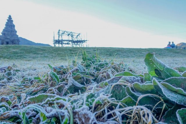 Fenomena embun beku atau bun upas yang terjadi di sekitar kawasan Candi Arjuna, Dieng, Banjarnegara, Jawa Tengah.(MI/LILIK DARMAWAN)