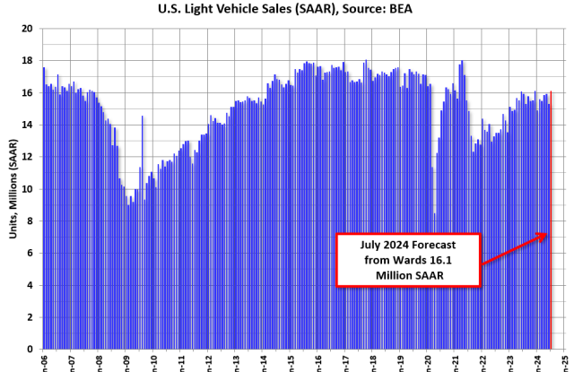 Dari WardsAuto: Pelacakan Penjualan Kendaraan Ringan AS bulan Juli hingga SAAR Terkuat Sejauh Ini pada tahun 2024 (konten berbayar). Kutipan singkat: