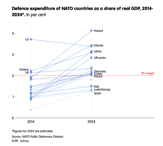 And according to the European Council on Foreign Relations (ECFR), the number of countries meeting the two percent target has risen from 3 to 23 since 2014: